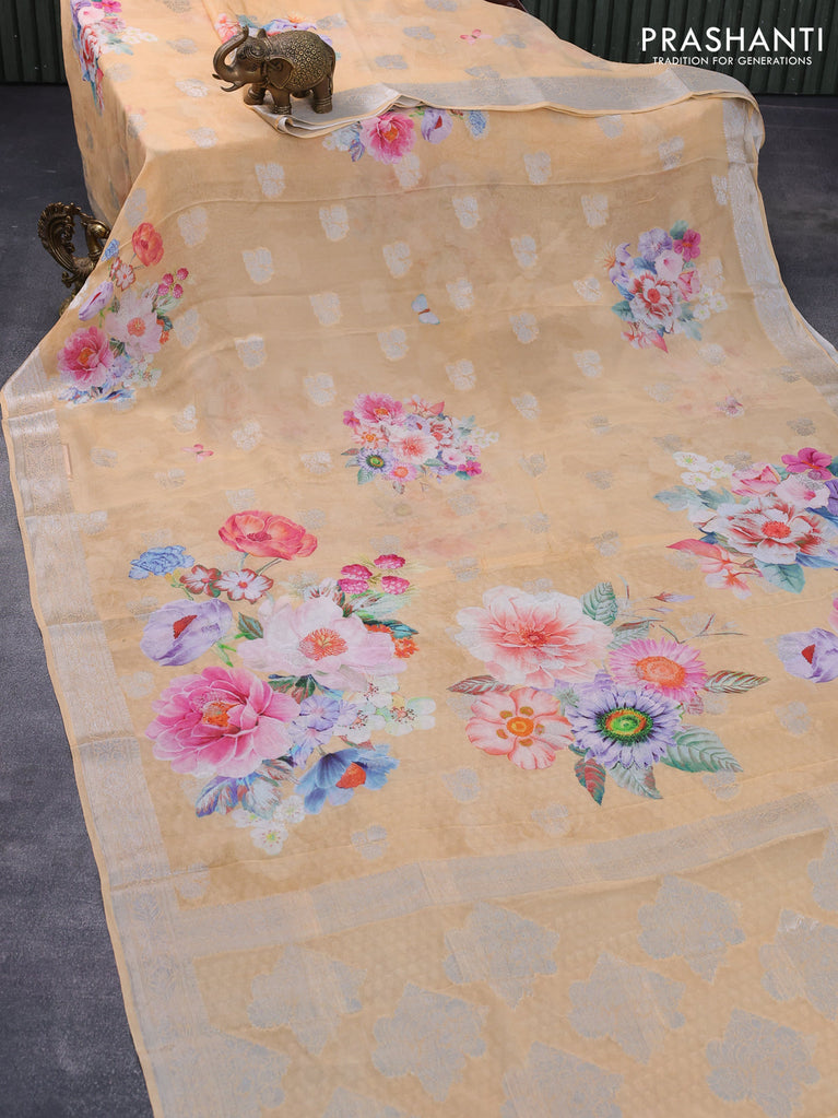 Chiffon silk saree pale orange with floral digital prints & silver zari buttas and silver zari woven border