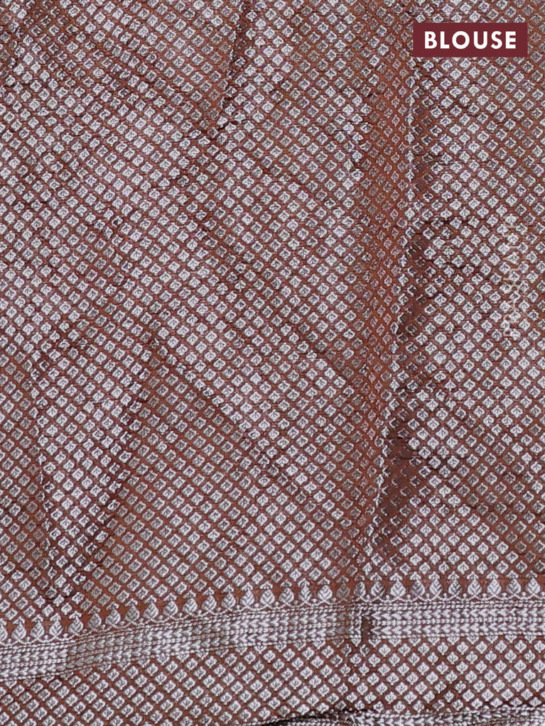 Chiniya silk saree rust shade with allover silver zari buttas & bandhini prints and silver zari woven border