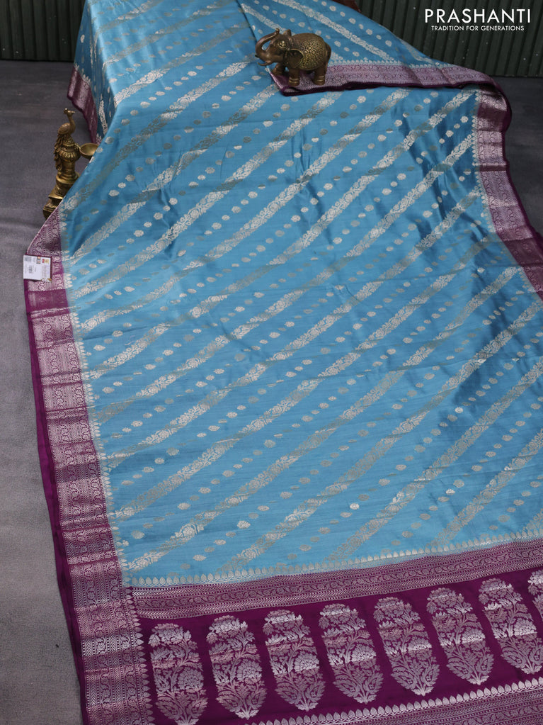 Chiniya silk saree pastel blue and wine shade with allover zari weaves and zari woven border