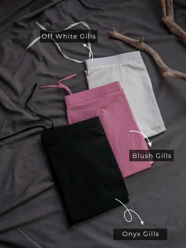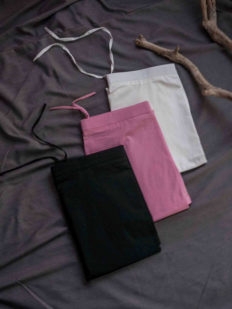A beautiful trio of 3 cotton-lycra underskirts in Blush, Off-White, and Onyx. The soft pink and neutral shades are paired with the deep, dark Onyx for a modern, elegant look. This set is perfect for anyone looking to add subtle but striking colors to their outfit.