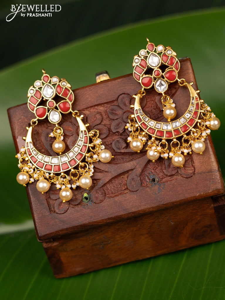 Antique screw type earrings chandbali design with pavalam & kundan stones and pearl hangings