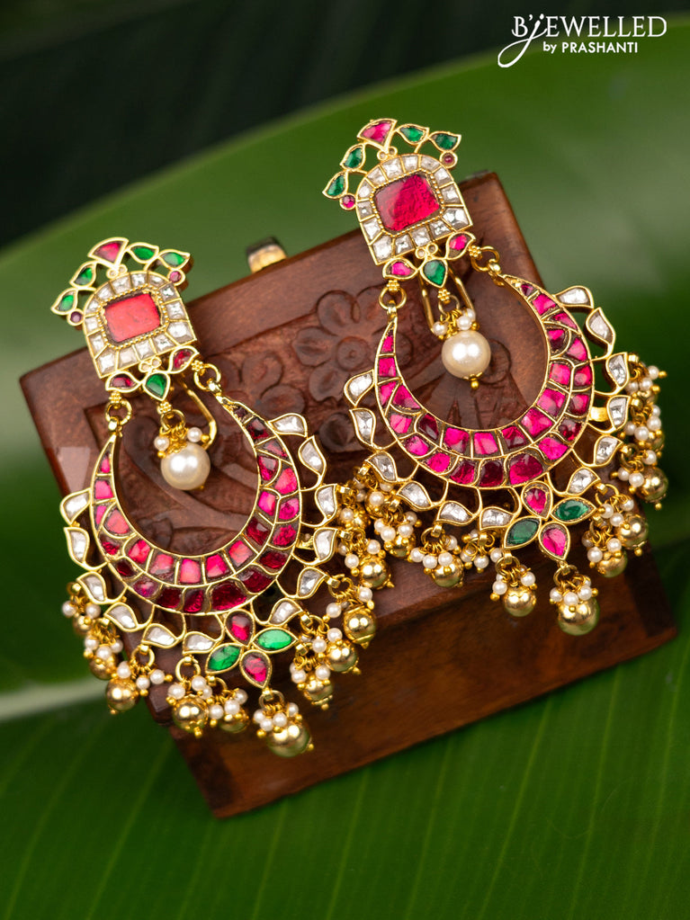 Antique screw type earrings chandbali design with jadau kundan stones and pearl & golden beads hanging