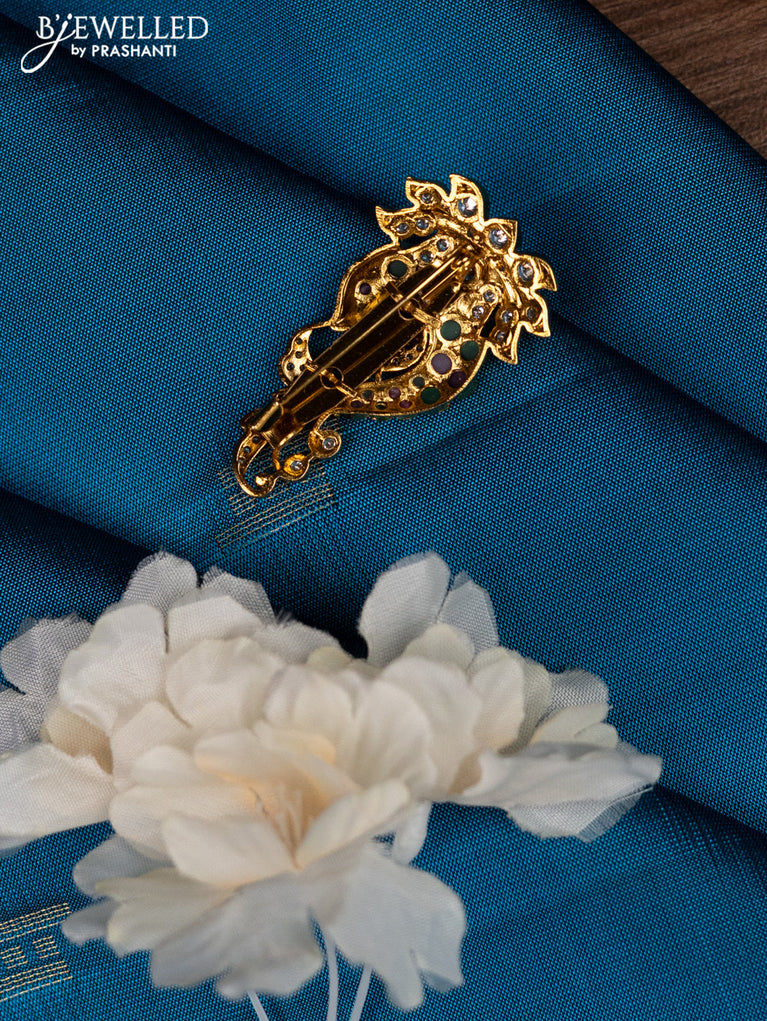 Antique saree pin kalasha & peacock design wih kemp and cz stones
