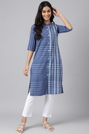 Blue band collar 3/4 sleeve kurta with placket detail.