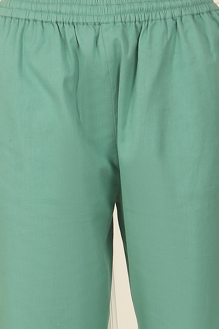 This kurta set has a blue kurta with lace yoke detail and matching trousers.