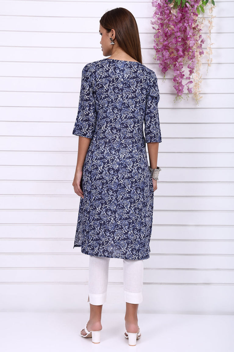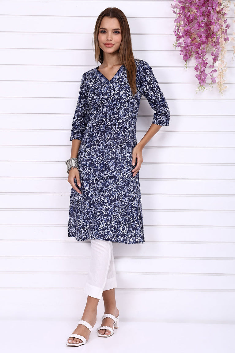 Add a touch of traditional artistry to your everyday wardrobe with this blue batik printed pure cotton straight kurta. Crafted from breathable and lightweight pure cotton, this kurta keeps you comfortable through the day while reflecting effortless style. The classic straight silhouette is both easy to wear and flattering, making it ideal for workwear and casual errands. The hand-inspired batik print in refreshing blue tones adds a rustic yet refined character, while the V neckline and 3/4th sleeves lend a timeless appeal. Perfect for daily wear, this cotton batik straight kurta for women offers a relaxed fit and clean finish that adapts well to both Indian and fusion looks.