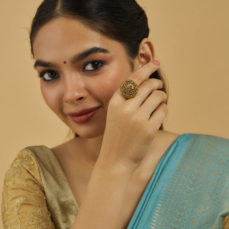 Intricate, festive, and contemporary, this fine ring is all. Adding a refreshing feel of full bloom, the white pearls, embossed gold plated floral design, floral rim, and hint of ruby stone, makes your look more exquisite and unique.