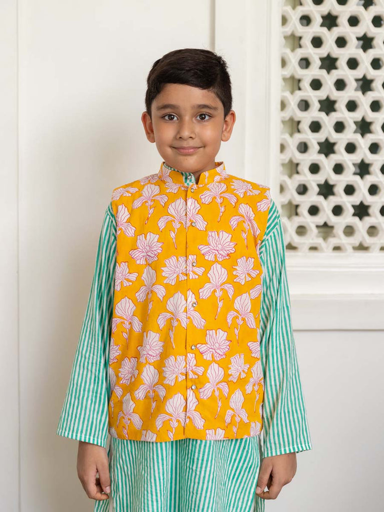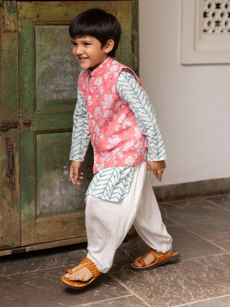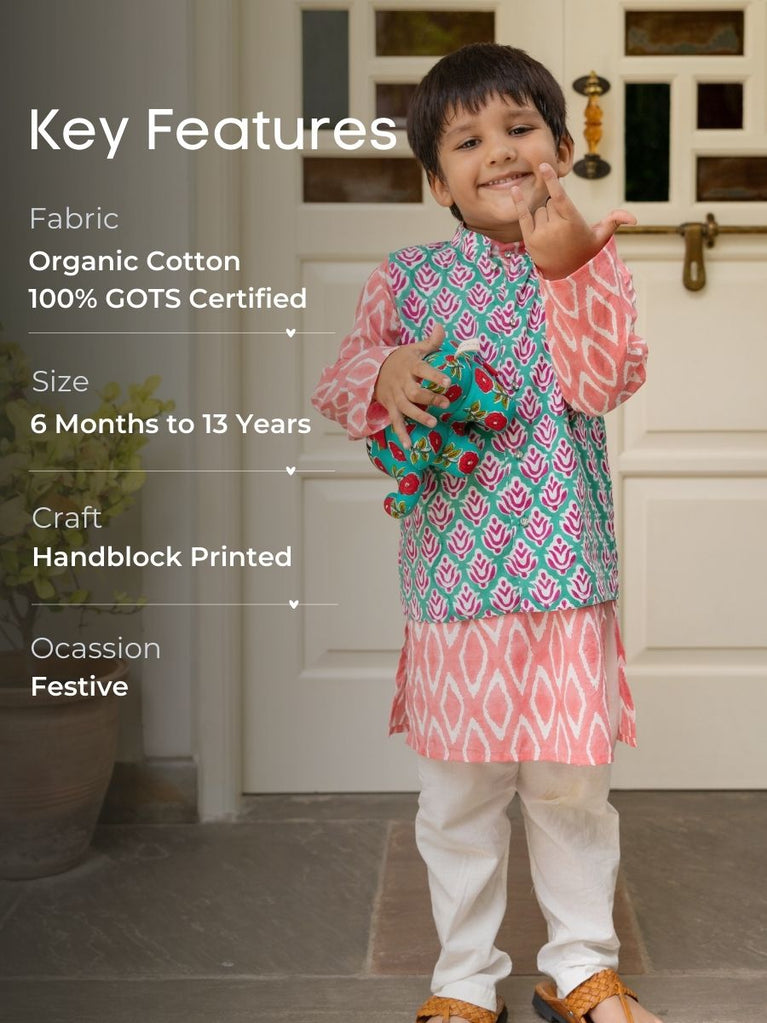 Set of 3 - Adwait Organic Cotton Block Printed Long Kurta with Jacket