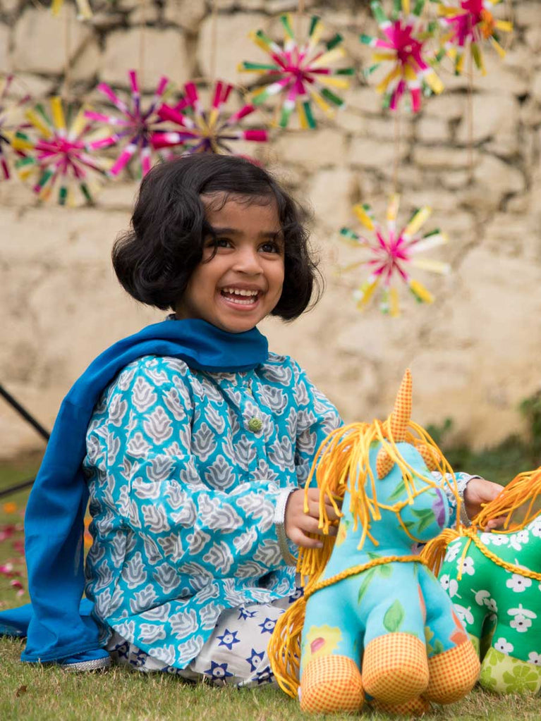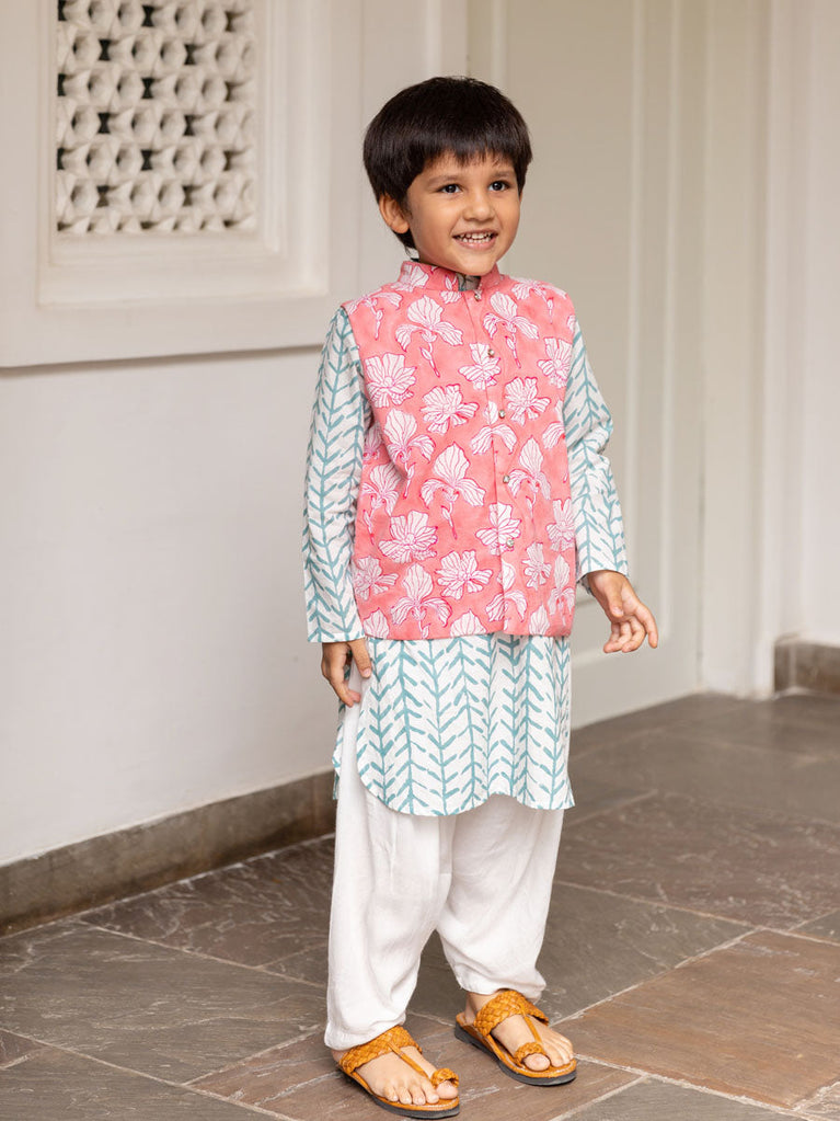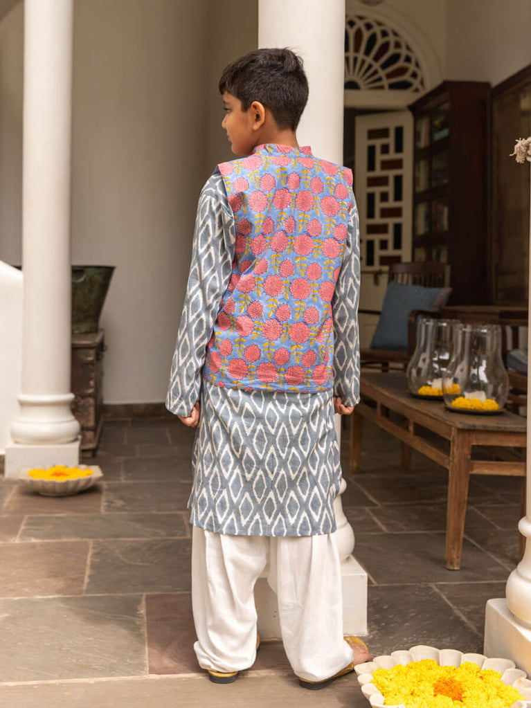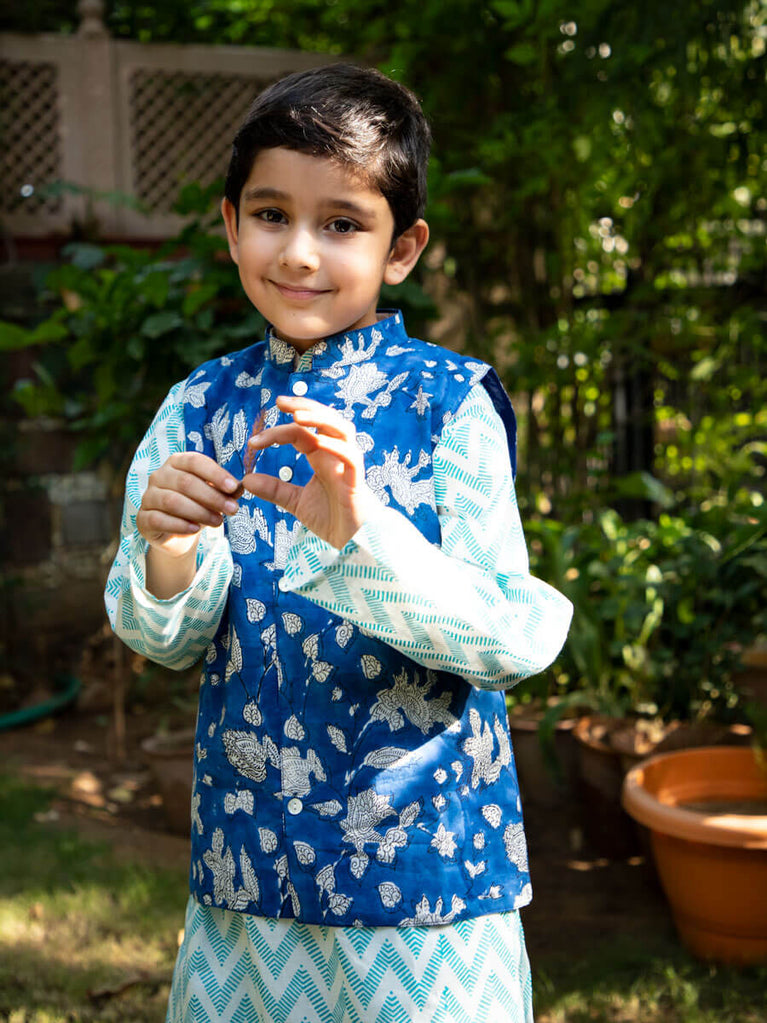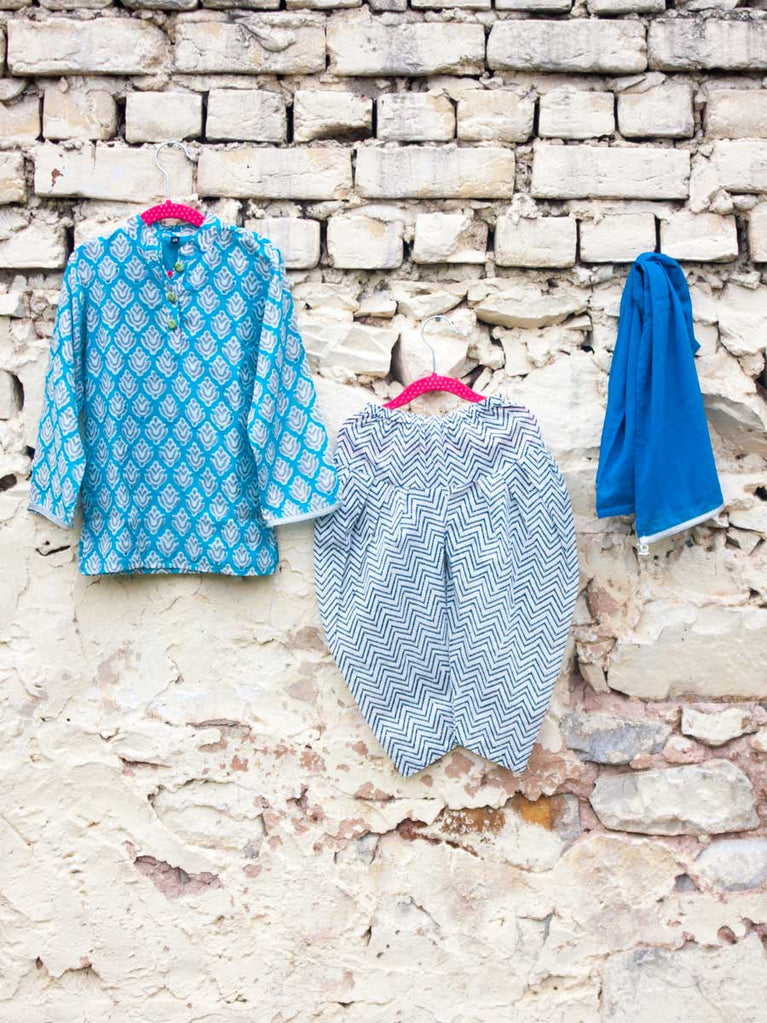 Set of 3 - Blue Sky Block Printed Kurta With Jacket