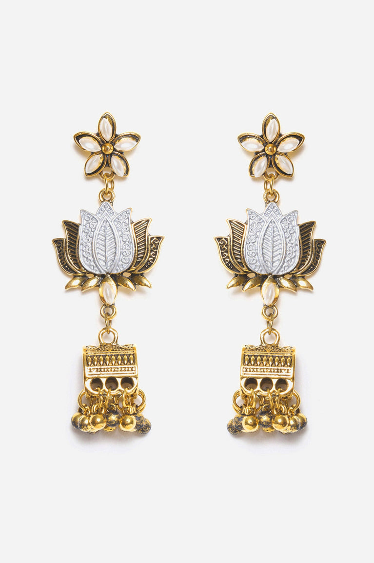 Gold Oxidised Lotus Motif Jhumki Danglers