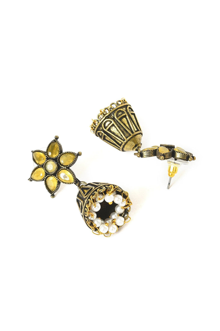 Elaborated Golden Oxidised Floral Jhumki Earrings With Monalisa Stones And Pearl Detailing