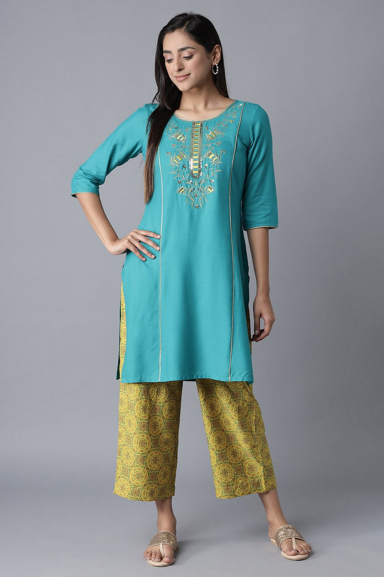 Peacock blue coloured round solid straight kurta having zari embroidery, round neck and three-quarter sleeves. To complement, the set contains matching palazzos with elasticated waistband and a contrasting golden coloured dupatta.
