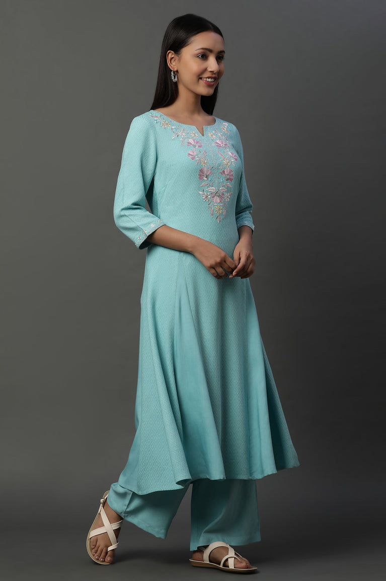 Be Ready For The Weekeed-Chilling Or A Brunch Look With This Pretty Blue kurta Set. The Set Include Blue Straight kurta Having Thread Embroidery On The Neckline. It Is Paired With Straight Palazzo In High-Rise And Elasticated Waistband.