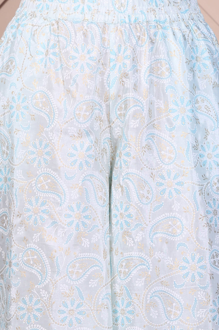 This elegant 3-piece set features a short kurta in textured fabric, designed in a serene sky-blue hue with intricate heavy yoke embroidery and a round neckline. The 3/4th sleeves are enhanced with an embroidered border, adding a refined touch. Paired with a tonal chikankari-printed semi-flared palazzo with convenient pockets on both sides, this ensemble combines comfort and sophistication. Completing the look is a chiffon drape with an all-over chikankari print in white, accented with blue details, making it perfect for festive and special occasions.