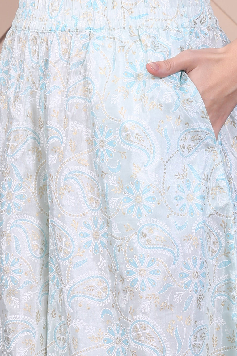 This Light Festive kurta Set Will Make A Gorgeous Addition To Your Ethnic Wear Wardrobe. Crafted In Premium Poly Shantung Fabric, This Zari Embroidered, Indigo kurta With Sequin Detailing Is Surely A Limelight Stealing Deal. It Comes With Ankle Length Palazzos Having Floral Print And Mid-Rise With Elasticated Waistband.