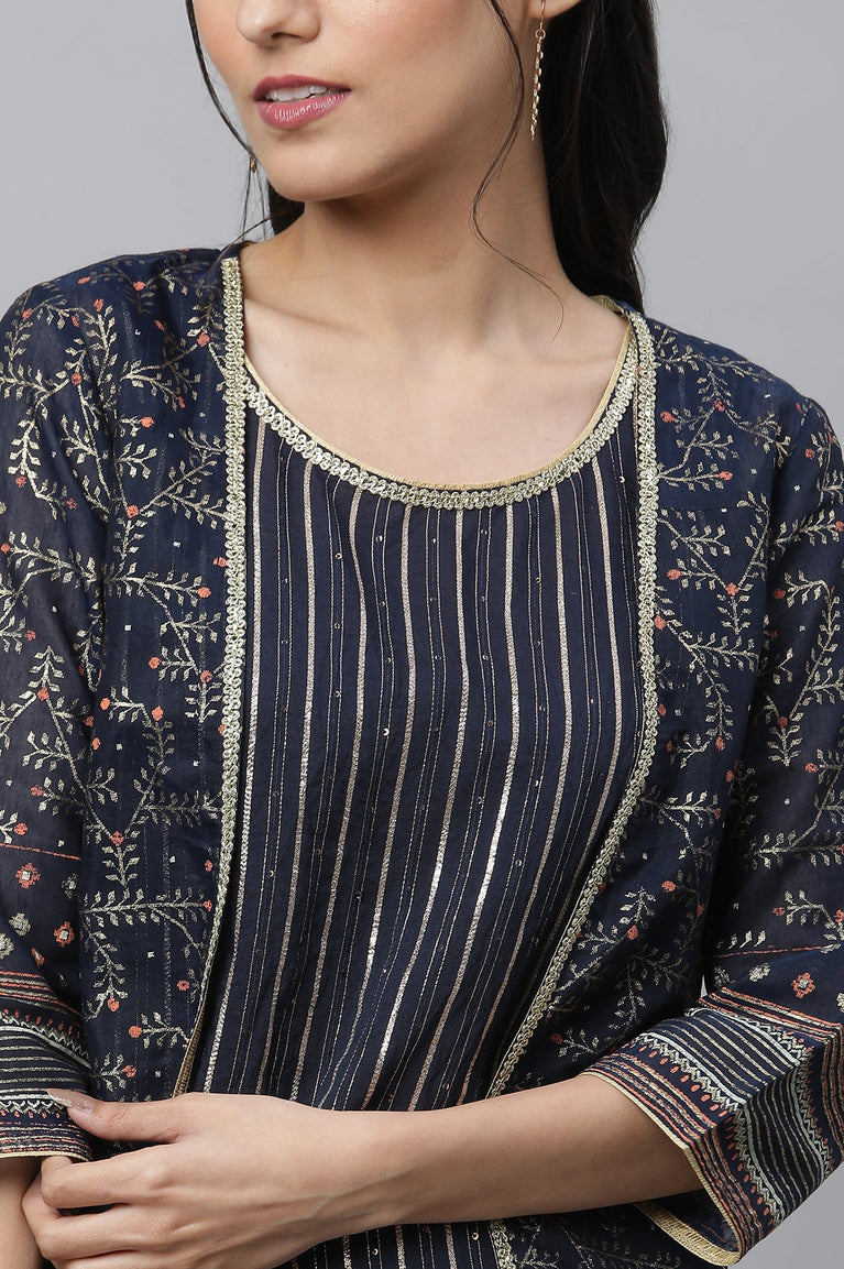 Be dressed la mode this festive season. Perfect for all occasions, this kurta set contains a blue all-over striped foil print kurta well-matched with solid palazzos.