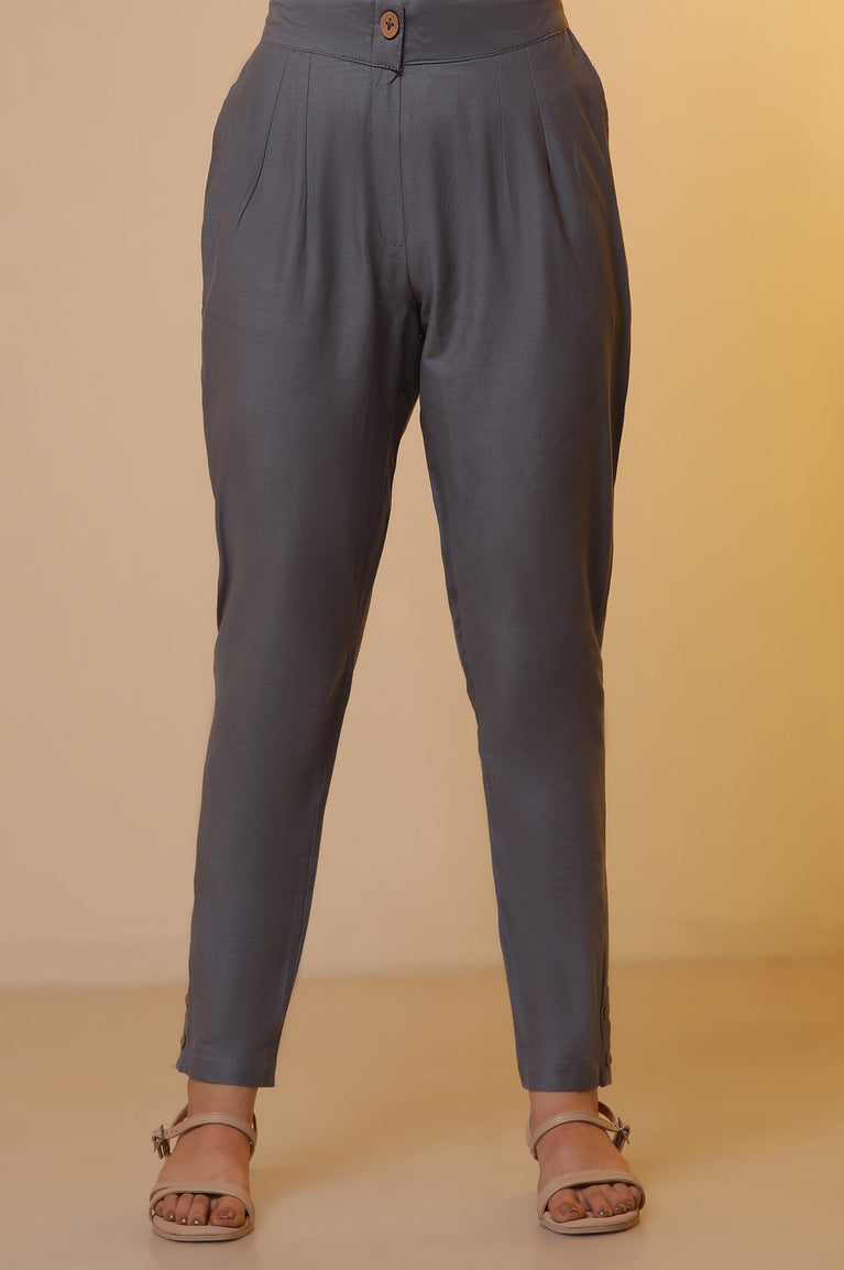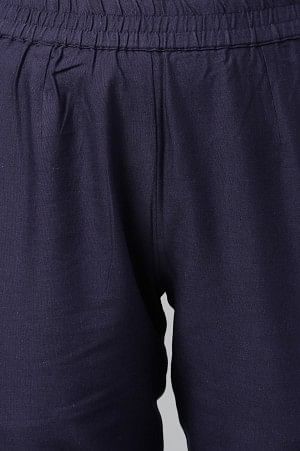 Chic ensembles designed to make you look gorgeous on the upcoming festivities. It features a blue glittered geometric print kurta having zari and thread embroidered round neck and three-quarter sleeves. Well-matched with ankle length slim fit solid trousers.