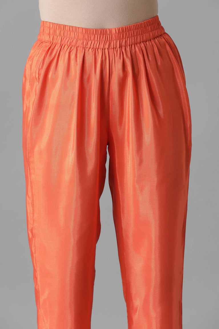 Go forth and dazzle them with this classy yet trendy kurta set. Featuring a blue glittered mughal print straight kurta that has a zari embroidered yoke with round neckline and three-quarter sleeves. Well-matched with contrasting orange slim fit solid trousers.