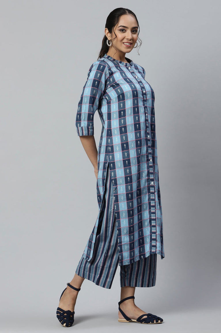 Blue Gingham Check Sleeveless Kurta and Straight Trousers Set