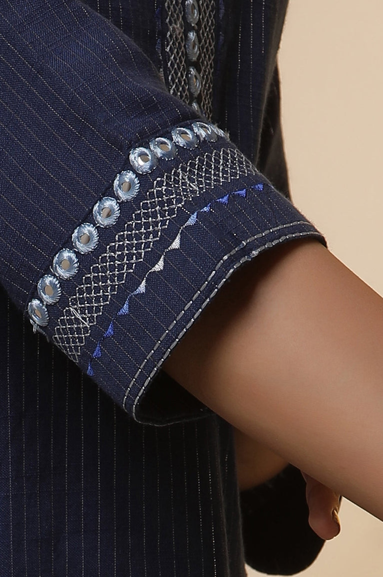 Let your style shimmer with this blue metallic embroidery kurta and parallel pant set. Featuring elegant metallic accents on a rich blue base, this outfit strikes a perfect balance between festive and refined. The straight silhouette gives it structure, while the parallel pants add comfort and movement. This metallic festive kurta works beautifully for evening events or formal functions. Style it with silver accessories or keep it monochrome for minimal drama. The blue metallic embroidery kurta brings sparkle in a poised and wearable way. Choose this metallic festive kurta when understated shine is your festive calling.