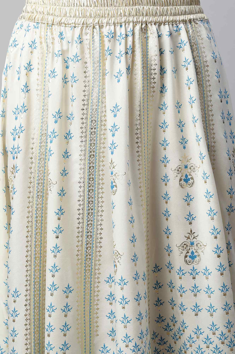 Blue Printed kurta In Mandarin Collar With Button Placket And Three-Quarter Sleeves. Paired With White Solid Palazzo In Mid-Rise And Elasticated Waistband.
