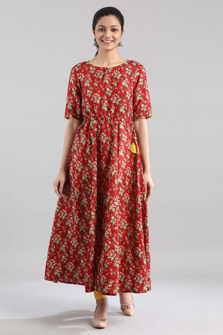 Brown elbow sleeves A-line kurta with tassel tie-up and round neckline.