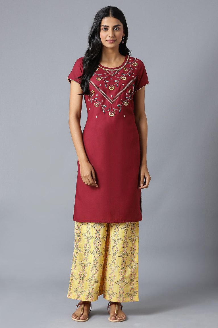 Brown Embroidered kurta In Round Neck With Yellow Straight Palazzo