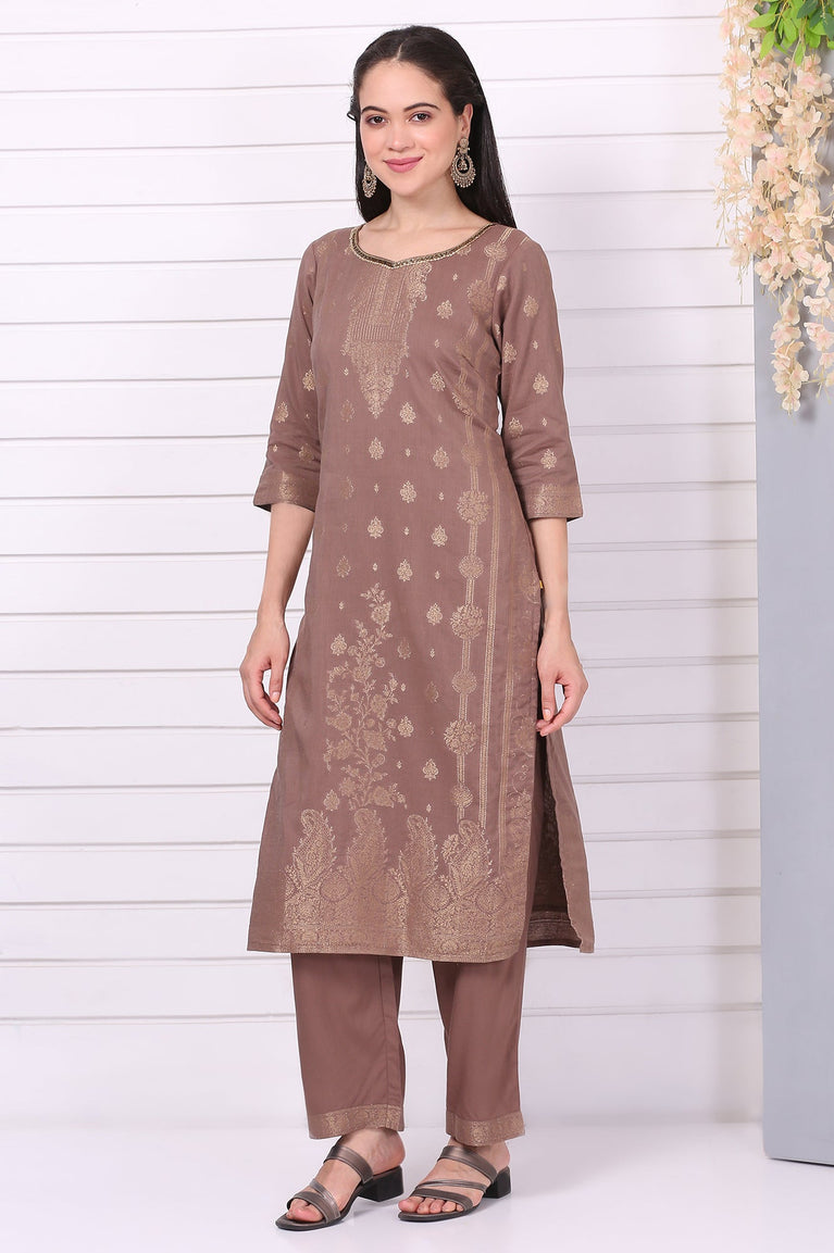 Festivities delve for contemporary attires with delightful hues, striking motifs and intricate detailing. This kurta set features a brown all-over mughal print kurta having zari embroidered yoke with round neckline and three-quarter sleeves. Well-matched with printed palazzos.