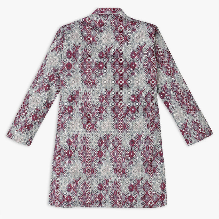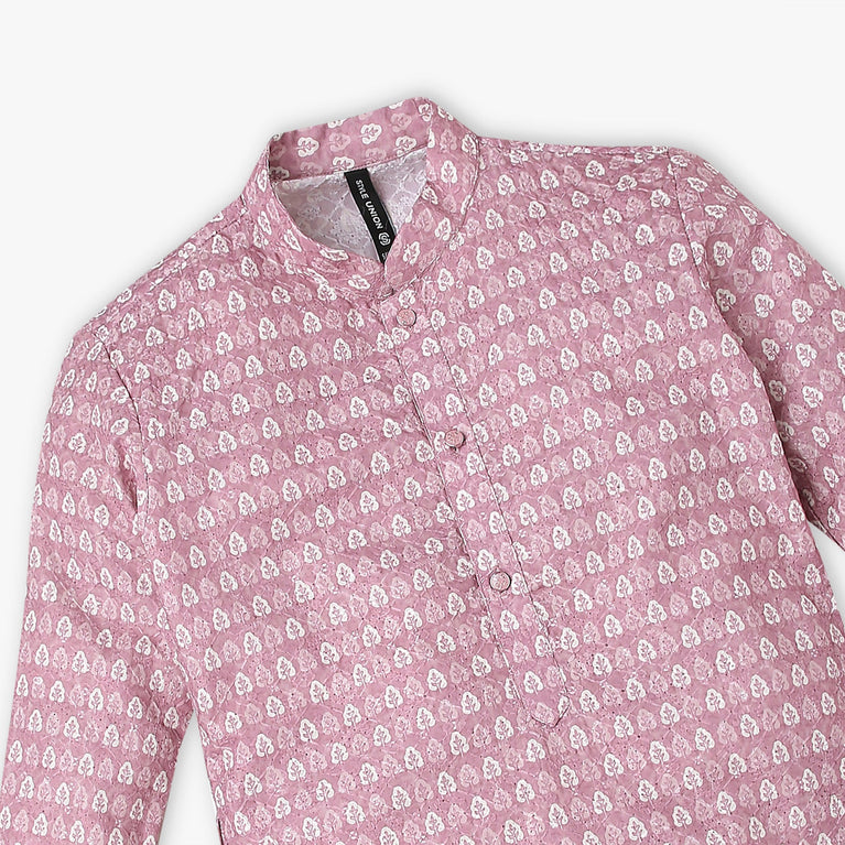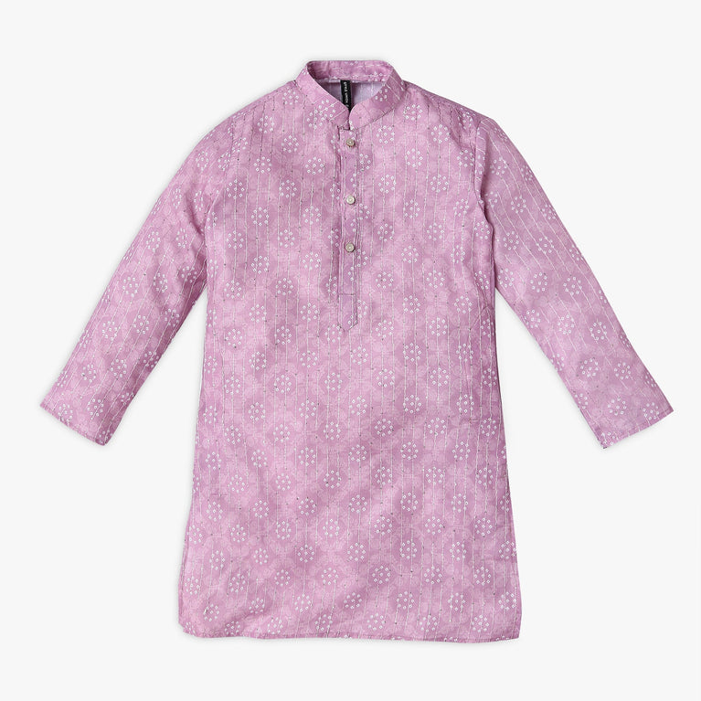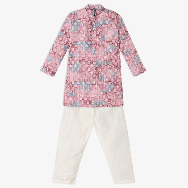These printed pattern kurta with pant set has mandarin collar and full sleeve. Made from polyester, your kid's feel comfortable wearing the product.