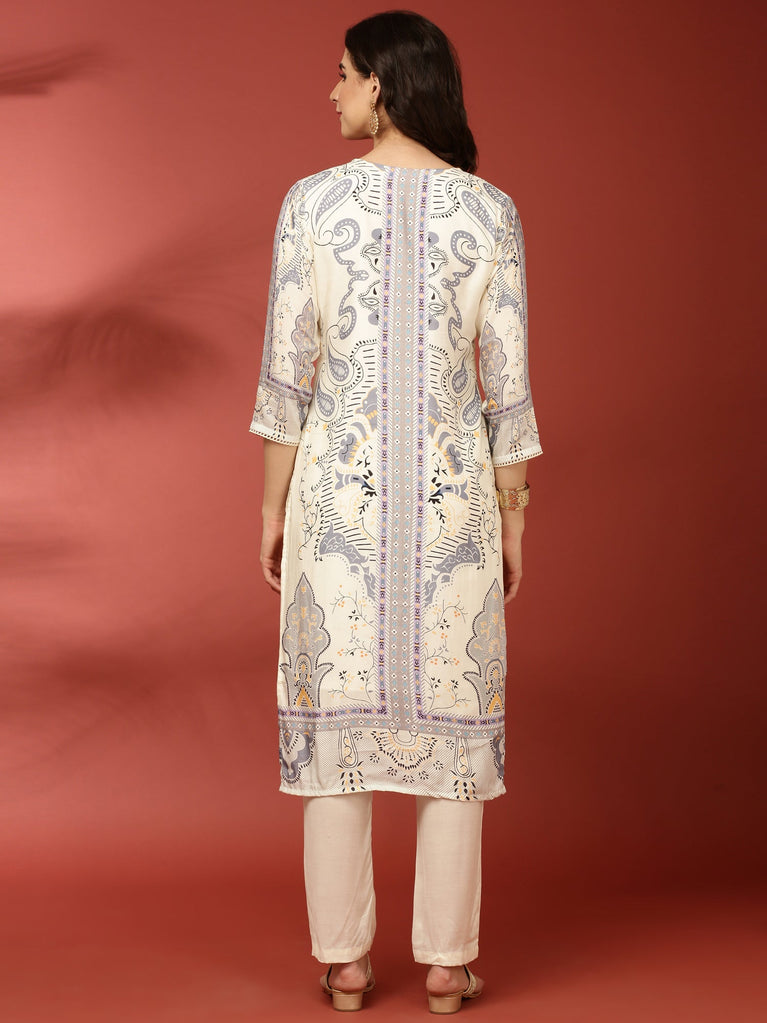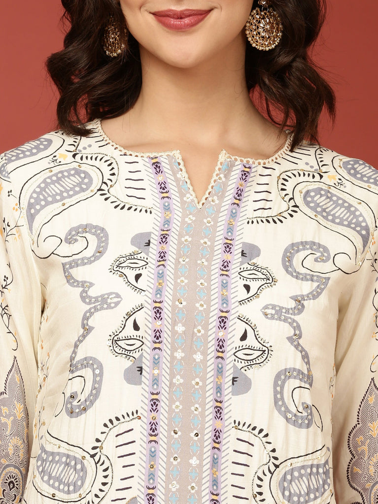 This cream muslin two-piece set features a delicate printed pattern that enhances its timeless elegance. Crafted from soft, breathable muslin fabric, it offers comfortable wear while maintaining a refined silhouette. Perfect for both casual and semi-formal occasions, this set combines sophistication with effortless style.
