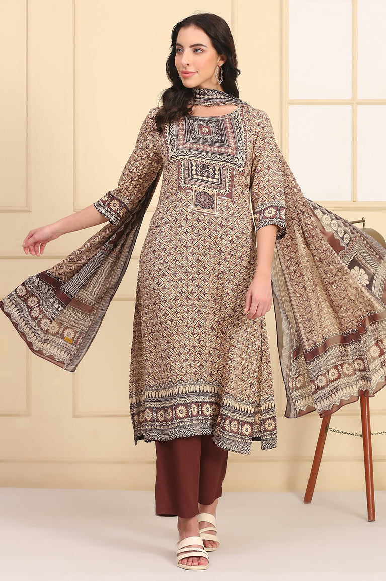 Brown Geometric Printed Zari Embroidered Georgette A-line Kurta, Leggings and Dupatta Set