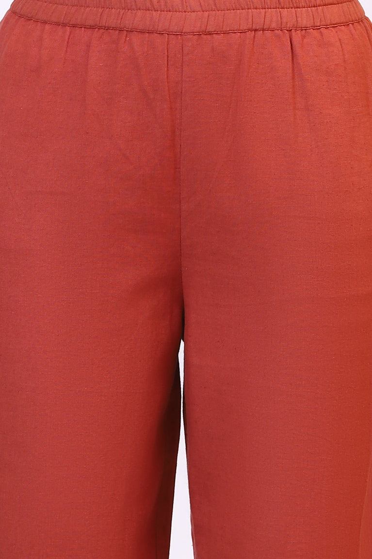 Revamp your casual ethnic wear wardrobe by adding these modern set. The set includes a brown straight fit kurta having thread embroidery on yoke and green straight palazzo pants.