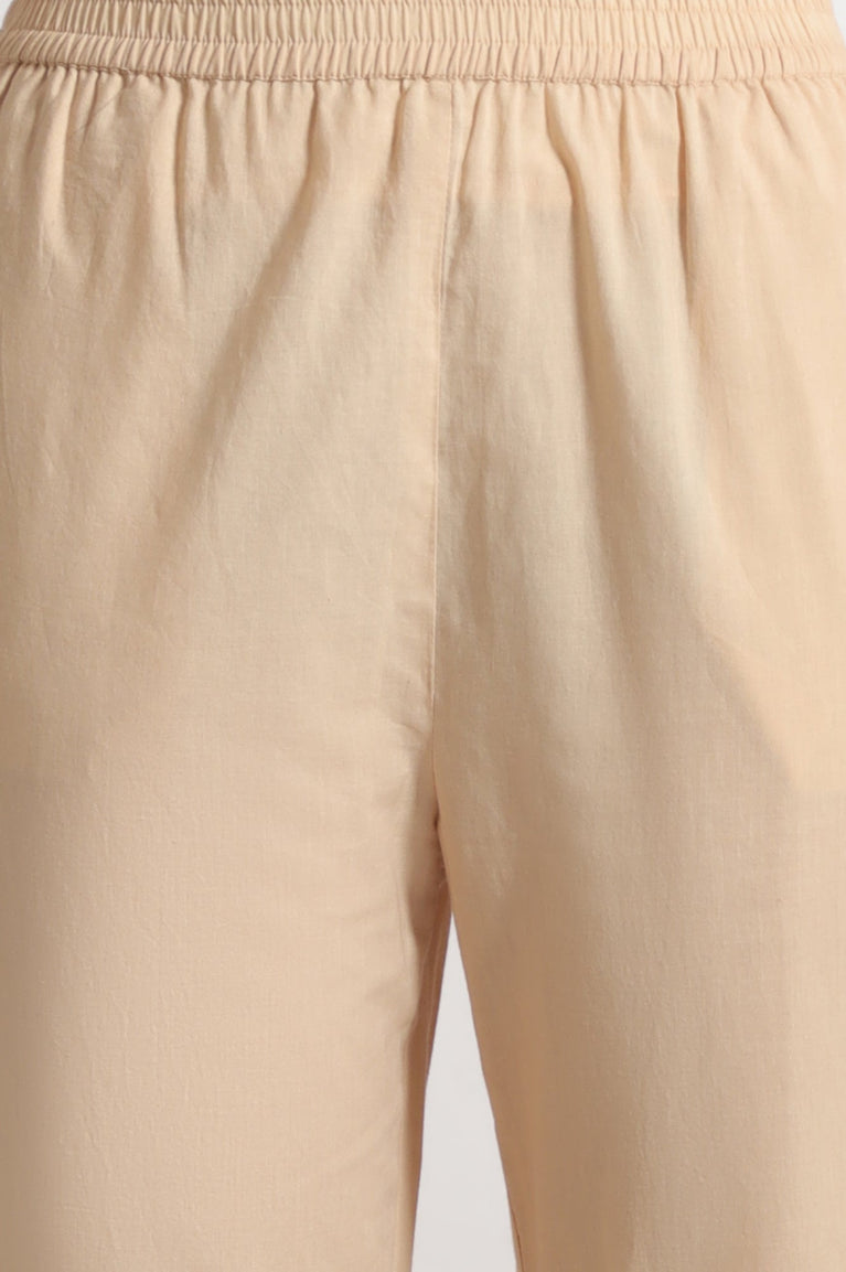 Beige Sleeveless Kurta, Featuring Tonal Schiffli On Cotton Flax. It Is Paired With Cropped Flared Pants With Lace And Schiffli Panel At Hemline.