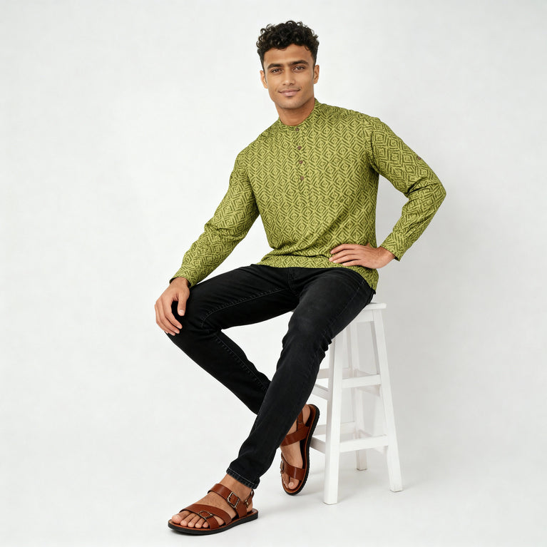 Elevate your wardrobe with our Cotton Printed Short Kurta, a stylish choice for modern men. Crafted from high-quality woven cotton, this kurta combines comfort with contemporary design for a versatile look.