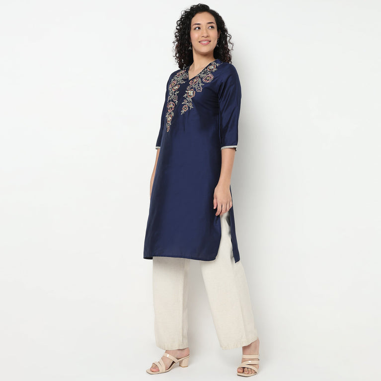 This embroidered pattern kurta has a round neck and three-fourth sleeve. Made from cotton, it is soft and comfortable to wear.