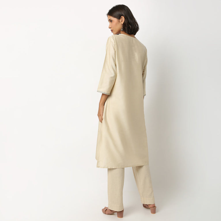 Bring a touch of festive luxury to your wardrobe with this taupe kurta from Diza. Detailed with gold-toned embellishments for a hint of radiance, it’s shaped in a flattering A-line silhouette with a V-neckline, three-quarter sleeves, and side pockets for everyday practicality.