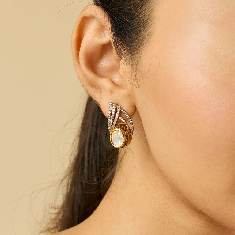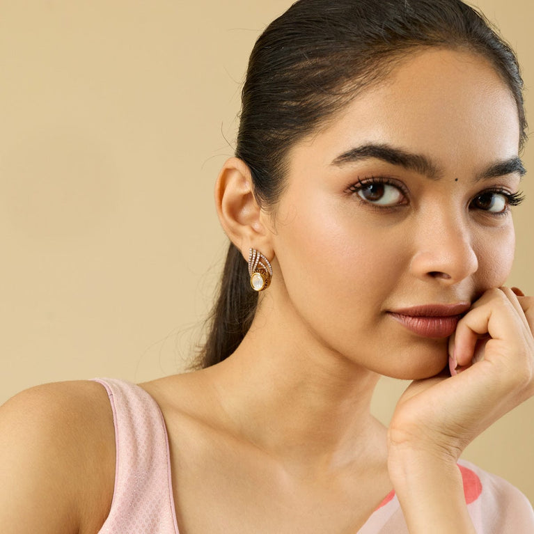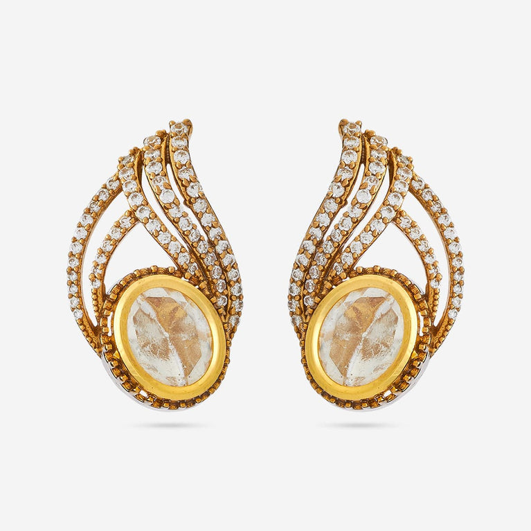 Kushal's White Casual Wear Stud Earring With Kundan Work This is a minimalist looking stud earrings that are absolutely perfect for daily wear. The pair has a gold-plated finish with white kundan stones. The design and the simple pattern give you an ample number of styling options. You can easily pair it with your western formals to get an elegant fusion vibe.
