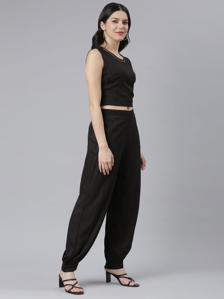 Neeru's Black Regular Straight Abstract Top And Trousers