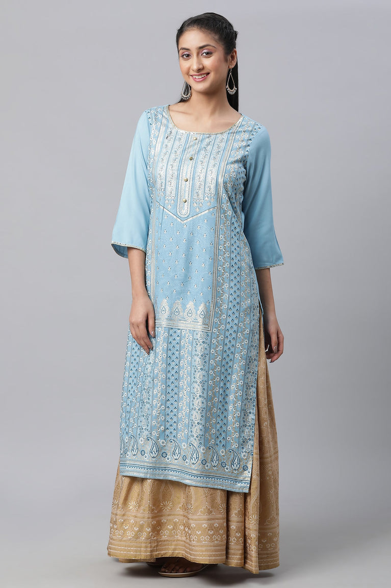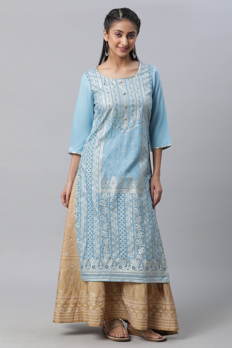 Flaunt your style in this pretty light festive kurta set. This set has blue printed kurta in straight silhouette. It is paired with golden tights.
