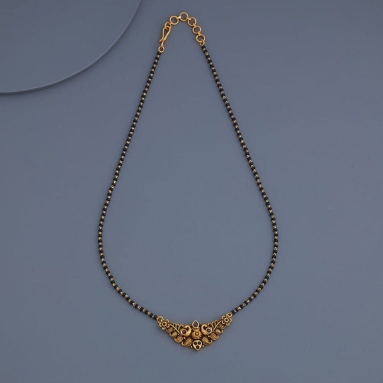 Kushal's Fashion Jewellery Flower Motif Antique MangalsutraIf you want to avoid the hassle of pairing your favourite Mangalsutra with earrings, allow our latest set of antique Mangalsutra and matching earrings to handle it for you. Thanks to its studded ruby stones with gold polish, this mangalsutra set with marvellous earrings will be your perfect partner for all events.