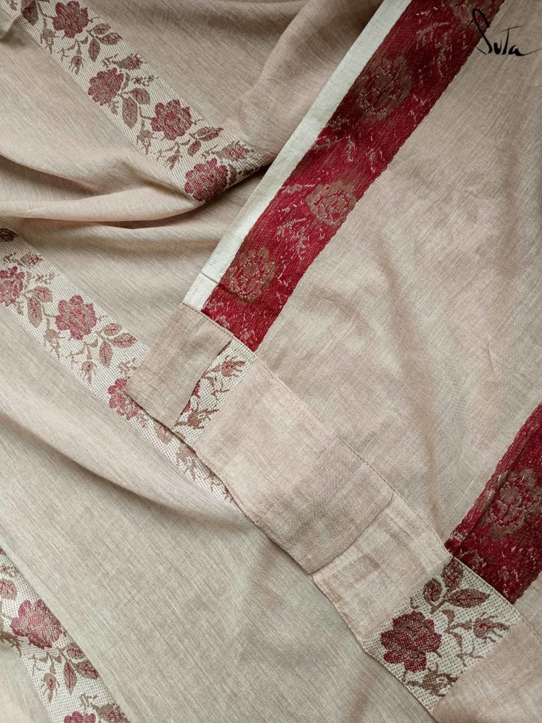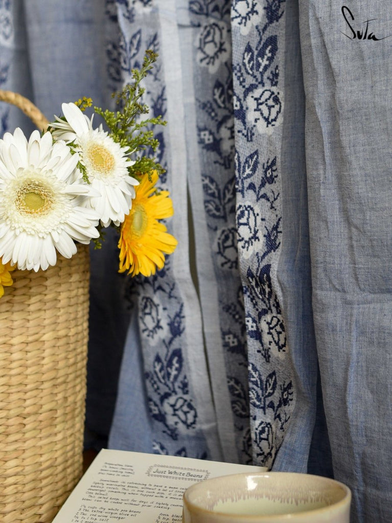 Suta’s signature ‘made in heaven’ mul cotton, is also known as mul mul in West Bengal. The fabric is buttery soft and has a delicate beauty. Its weave is very fine and this lends a very fluid texture to the fabric. These curtains also feature woven floral motifs to add an air of sophistication to the fabric.