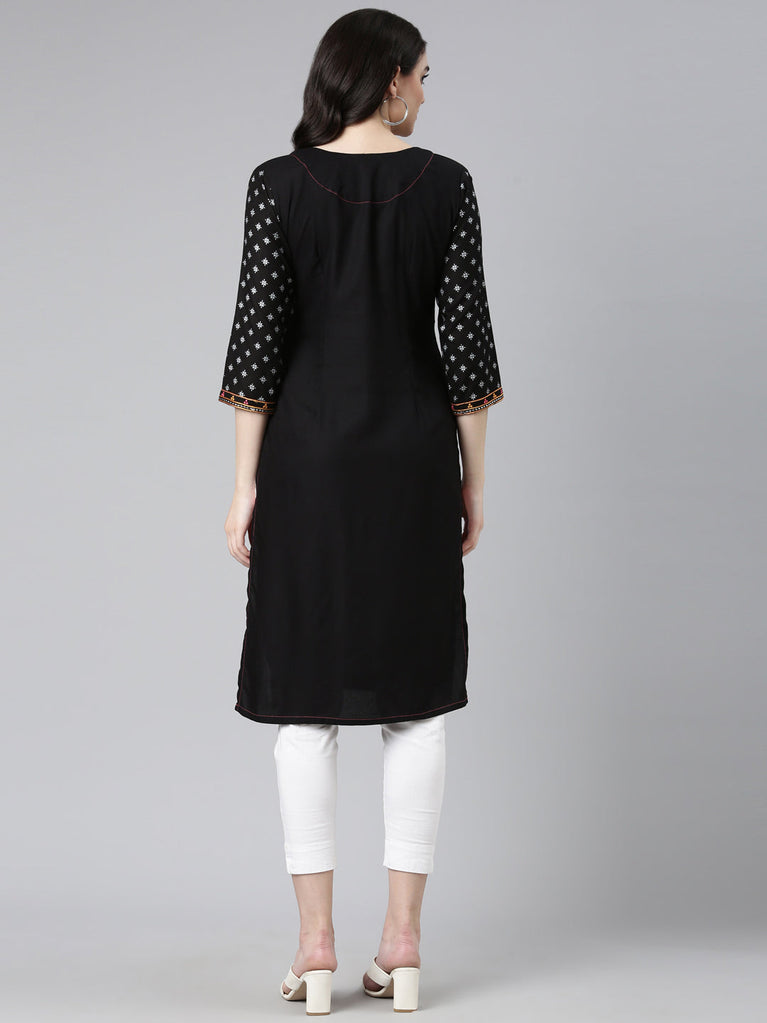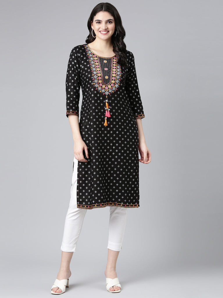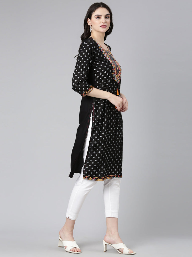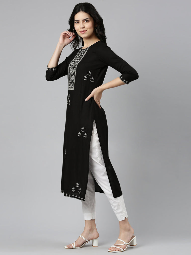 Neeru's Black Regular Straight Embroidered Kurtas