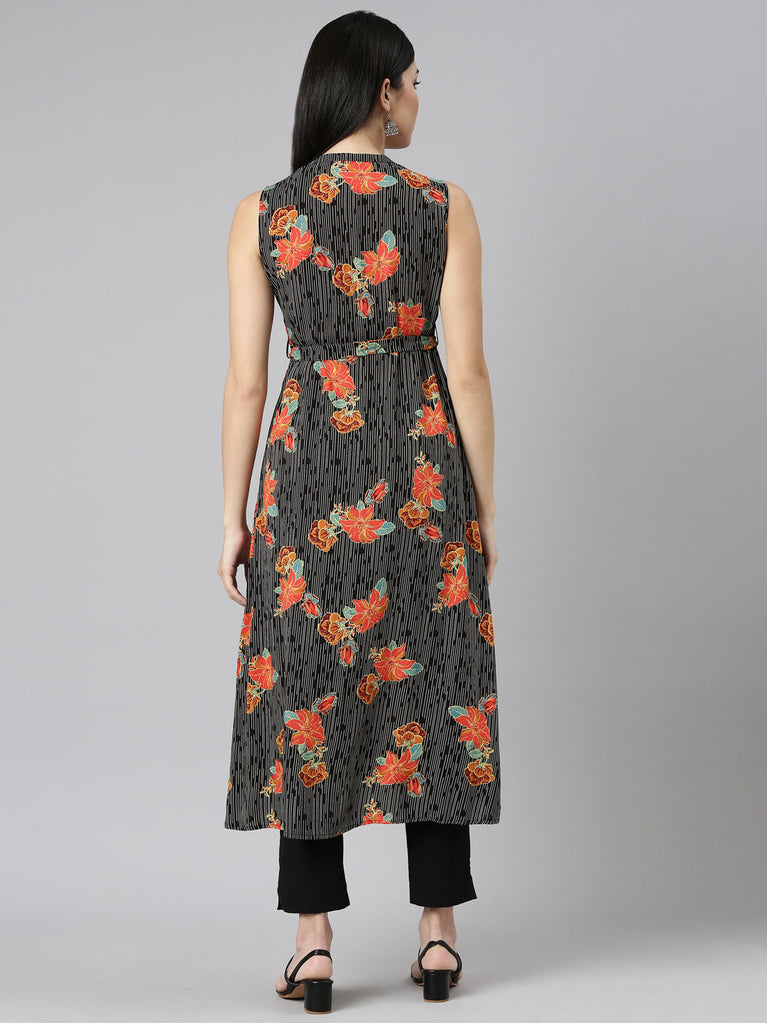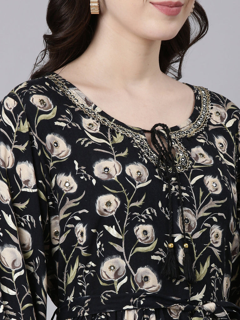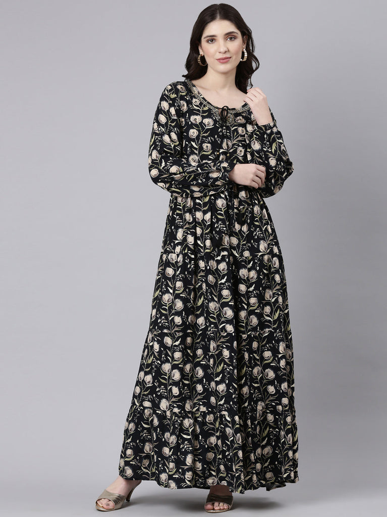 Neeru's Black Flared Casual Floral Dresses