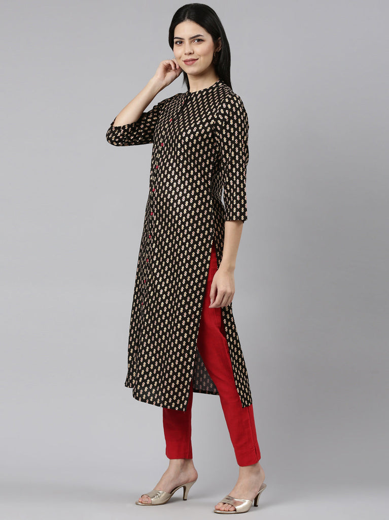 Neeru's Black Regular Straight Printed Kurtas