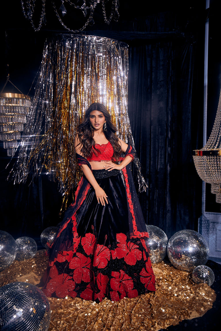 Presenting Neeru's Luxuriant Black Chiffon Ghagra Set, Adorned By A Beautiful Floral Print. A Statement Piece For Special Occasions, Crafted To Command Attention And Evoke Sophistication.