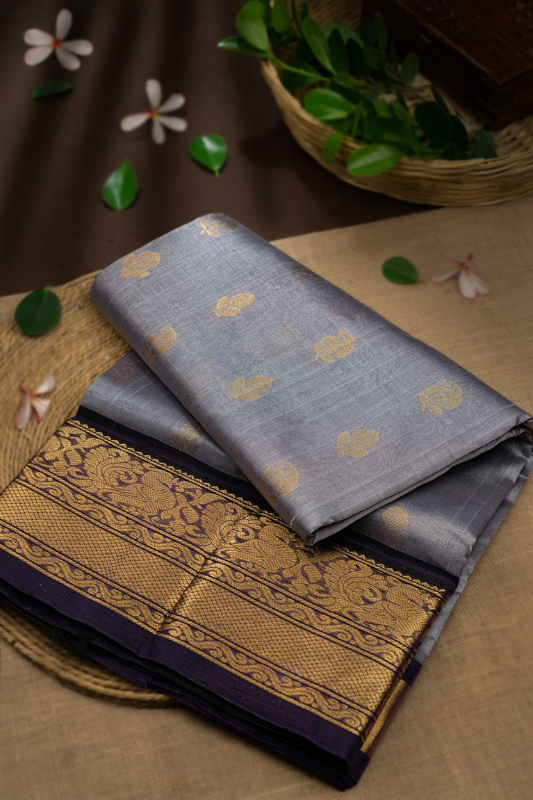 Mandir Light Grey & Navy Blue Kuppadam Buttis Saree