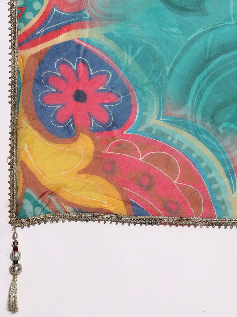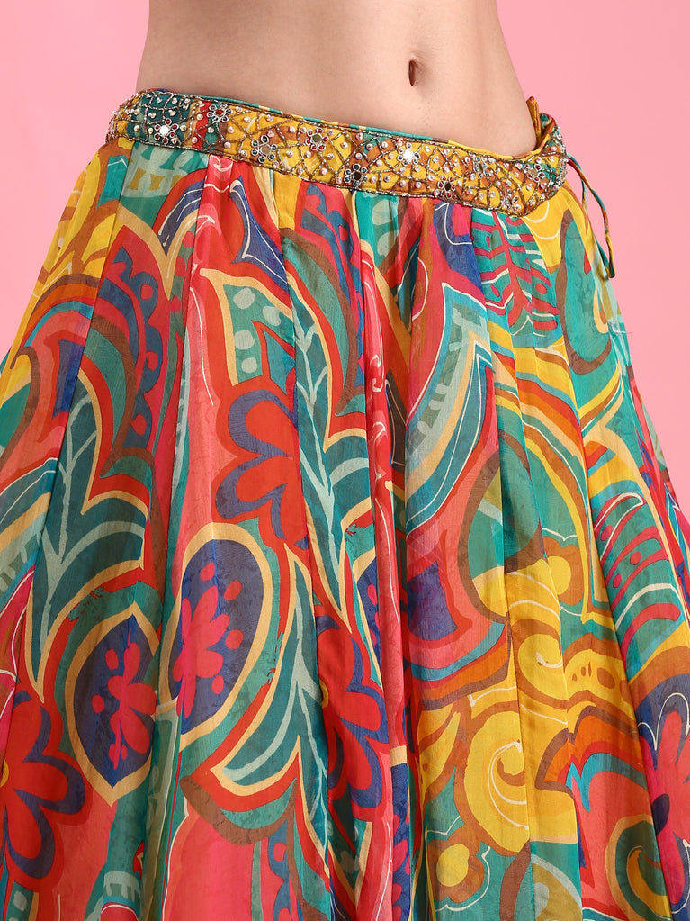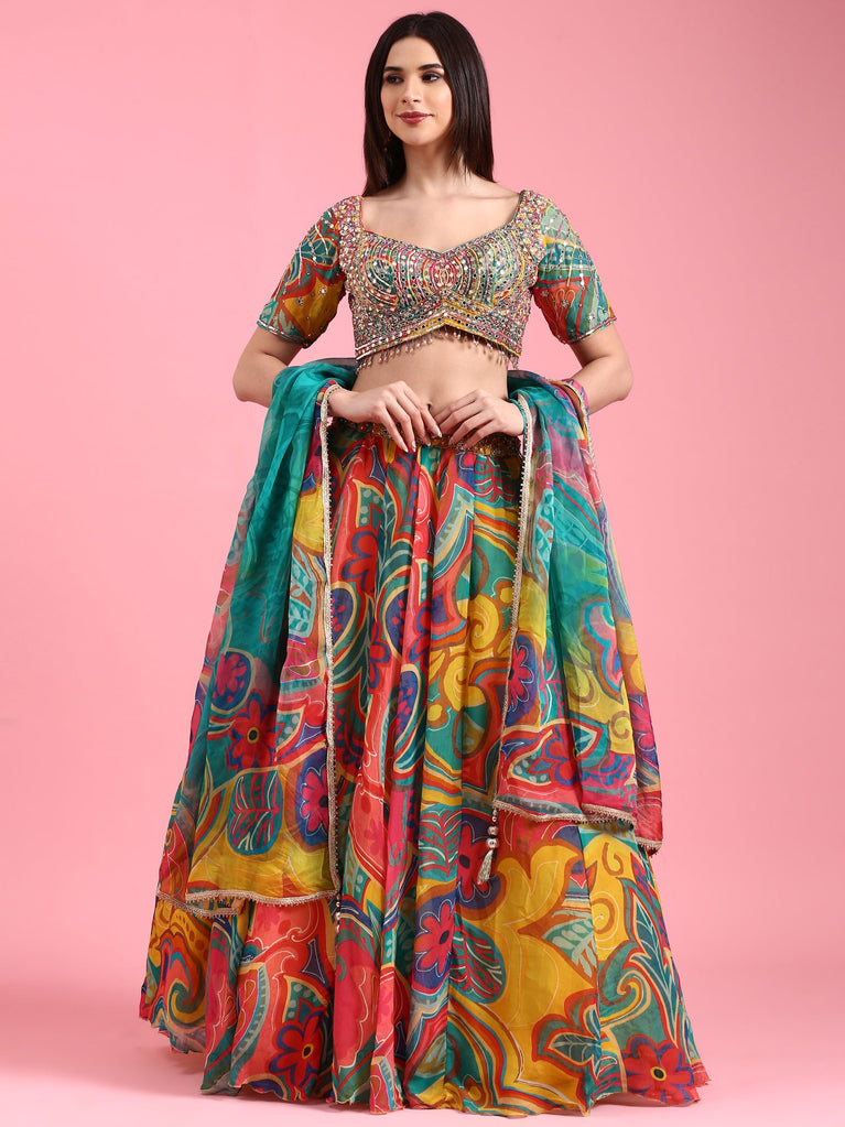Elevate your festive wardrobe with this Multi-color Organza Printed Ghagra Choli Set. Crafted from lightweight organza, the ensemble features delicate prints that blend vibrant hues for a graceful look. The flowing ghagra paired with the tailored choli ensures comfort while enhancing your silhouette, making it perfect for weddings and special occasions. This set combines traditional charm with contemporary elegance effortlessly.