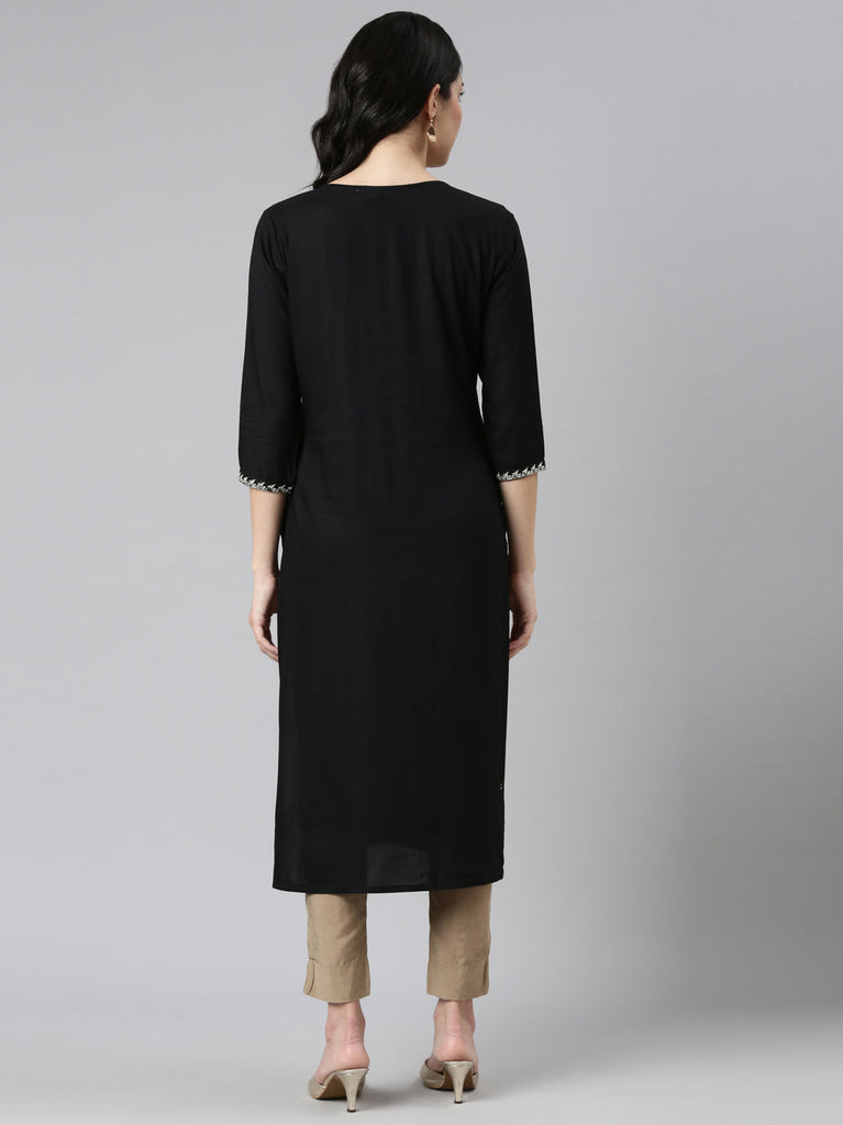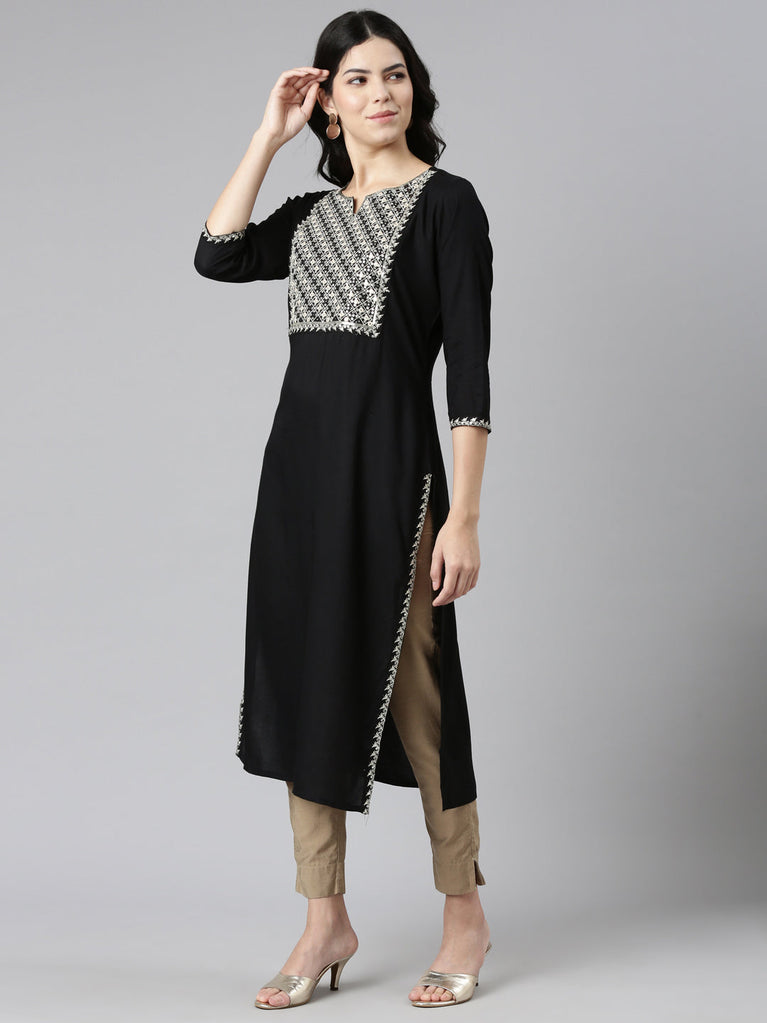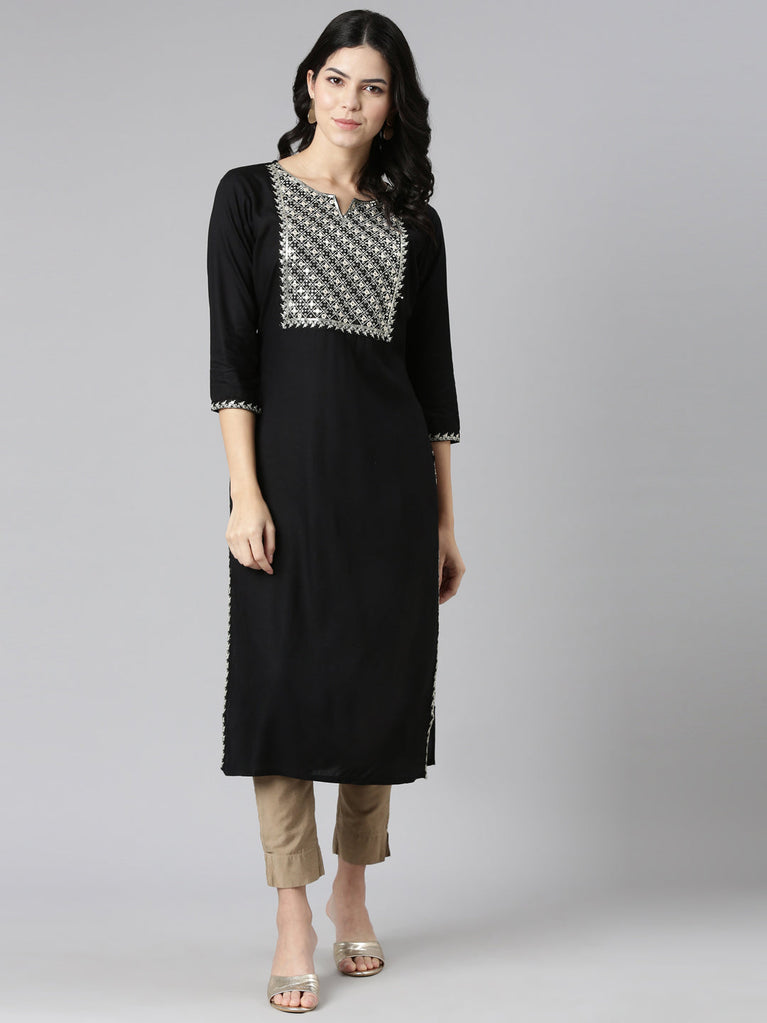 Neeru's Black Regular Straight Embroidered Kurtas This Flirty Kurta Is Perfect For Sprucing Up Your Warm-Weather Wardrobe. Add A Bit Of Boho Vibes To Your Look With The Embroidered Details And Flirty Silhouette!