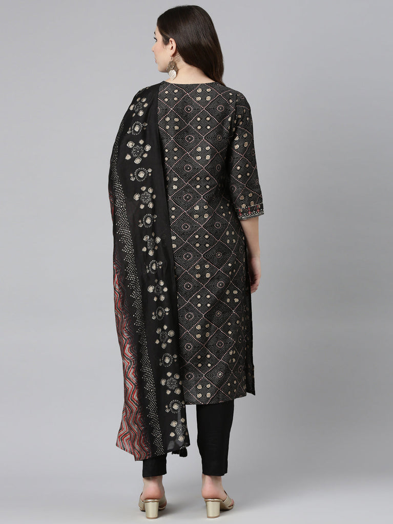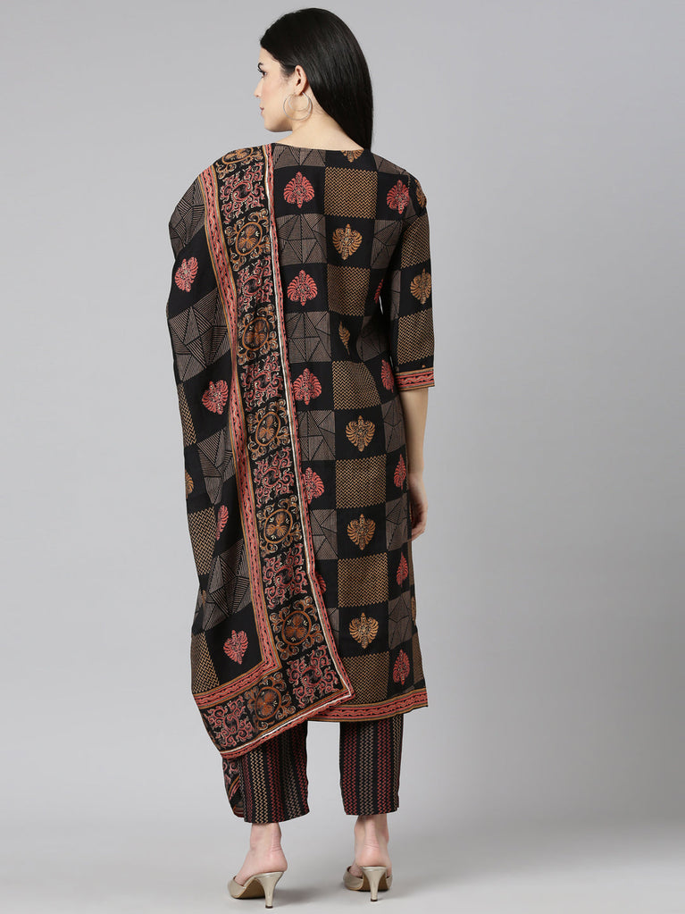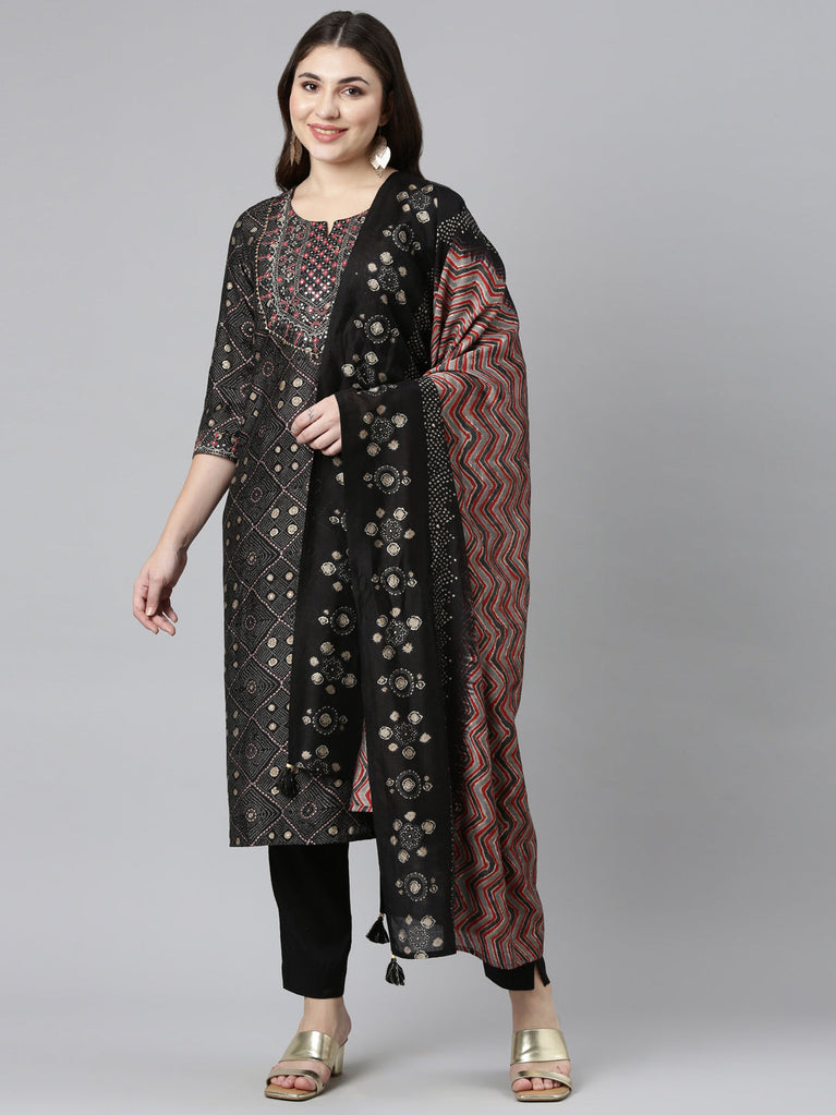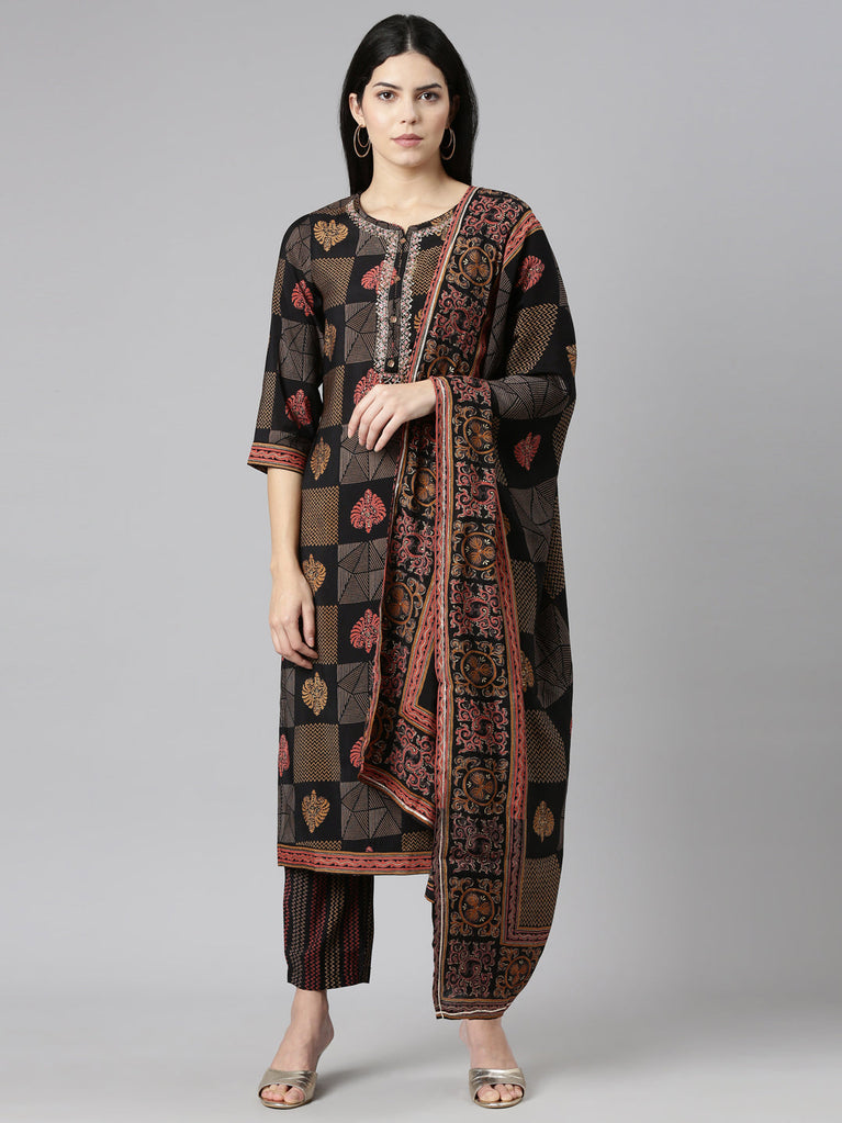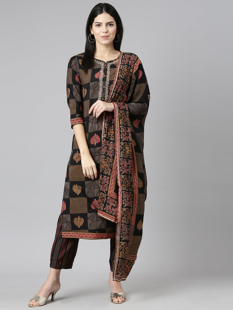 Neeru's Black Regular Straight Printed Readymade Suit An Ensemble Fit For A Queen Look Divinely Chic In This Colorblock Combo, Complete With Chic Trousers And A Dupatta For An Extra Dose Of Sophistication.