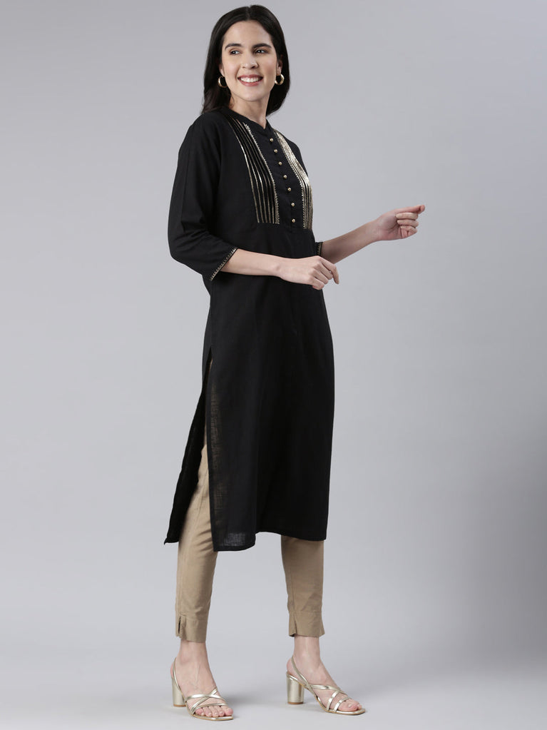 Introducing Neeru's Black Straight Solid Cotton Kurta, The Best Way To Look Graceful And Elegant. Made Of Pure Cotton, This Knee-Length Kurta Features Delicate 3/4 Sleeves And A Tasteful Side Cut. Perfect For Any Occasion, This Piece Will Add A Luxurious, Sophisticated Touch To Your Wardrobe.